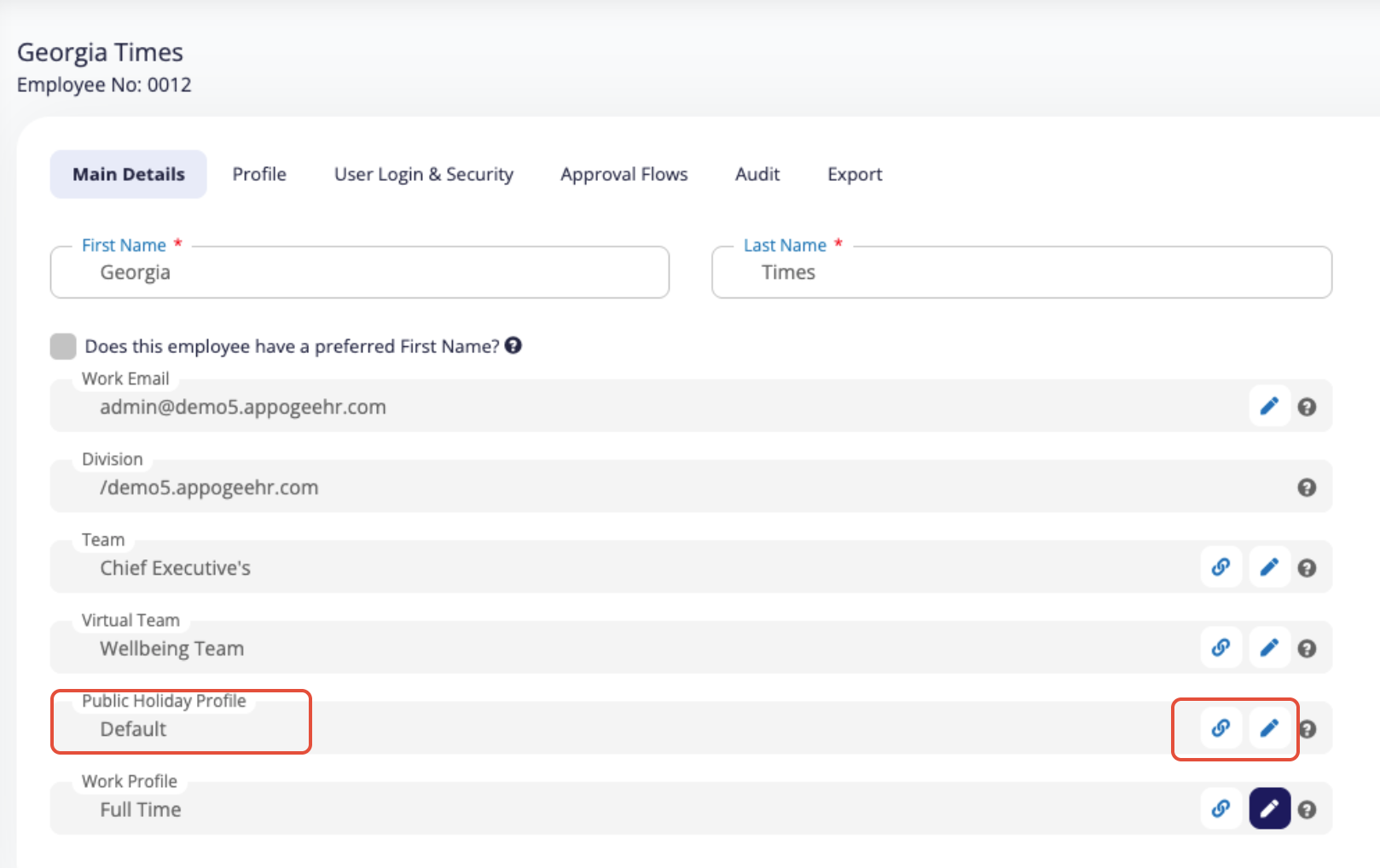 Once you've created a Public Holiday Profile, you'll be able to add this configuration to your users. To do this, go to Organisation > Employees > Select Employee > Public Holiday Profile. Click the edit pencil to amend.