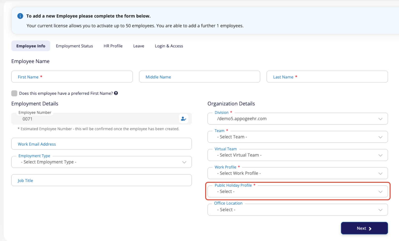 The Public Holiday Profile is also a required field when adding employees into the system, so you'll need to set up the relevant Public Holiday Profiles before adding your employees into Cintra People HR.